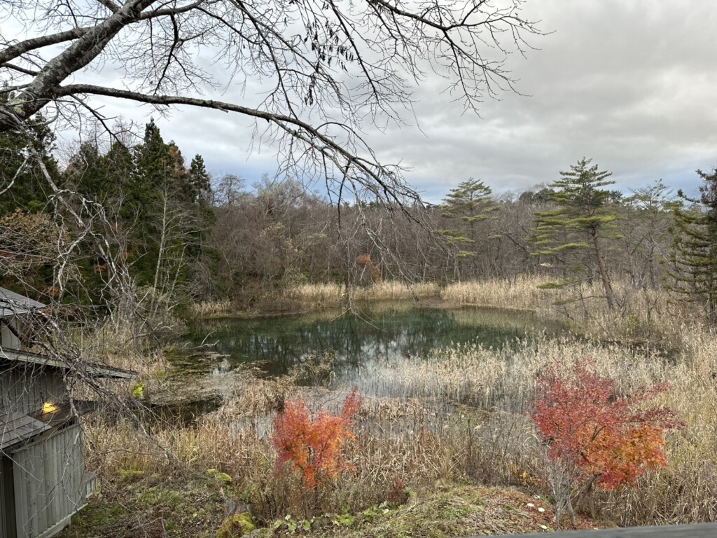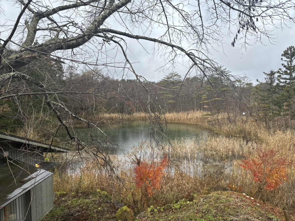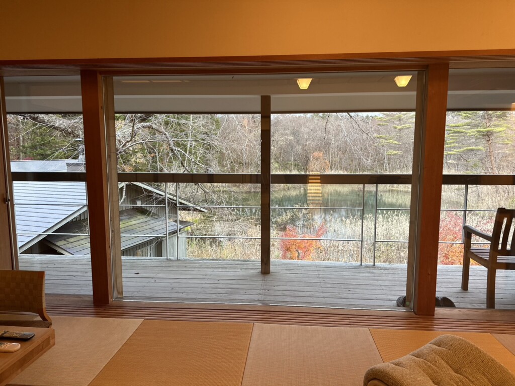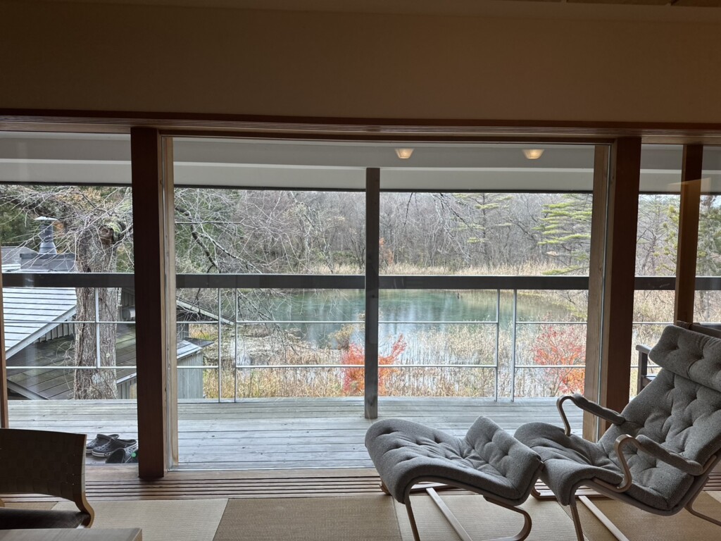 バルコニーからは、四季折々の森とエメラルドグリーンの美しい沼が見渡せます。